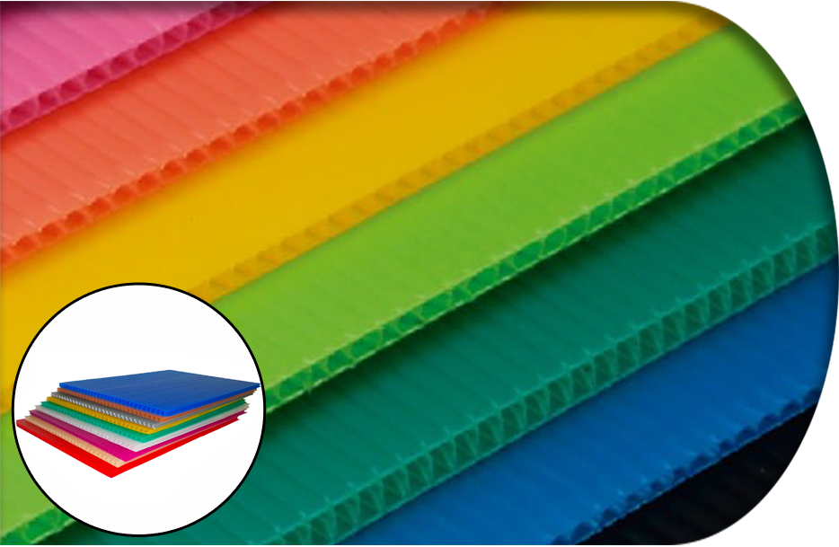 Láminas de polipropileno extruidas (cartón plástico), de 3 mm de grodor. Permite troquelado.reciclable y resistente a agentes químicos.